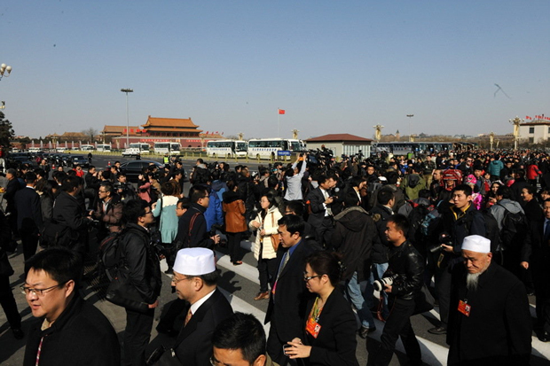 3月3日,中国人民政治协商会议第十二届全国委员会第一次会议即将在北京人民大会堂开幕。这是全国政协委员抵达天安门广场。