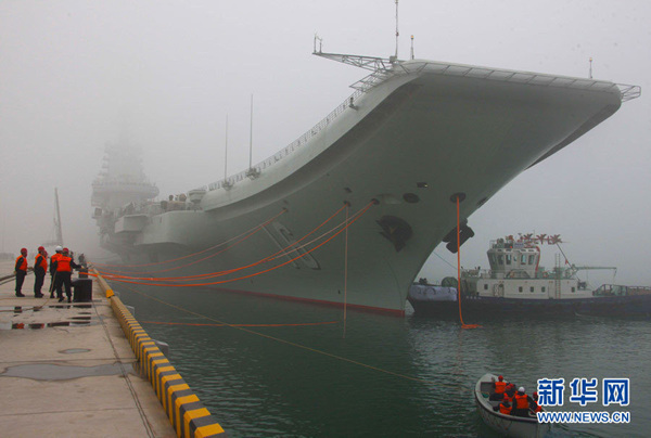 官方发布的辽宁号首次停靠青岛某军港的照片
