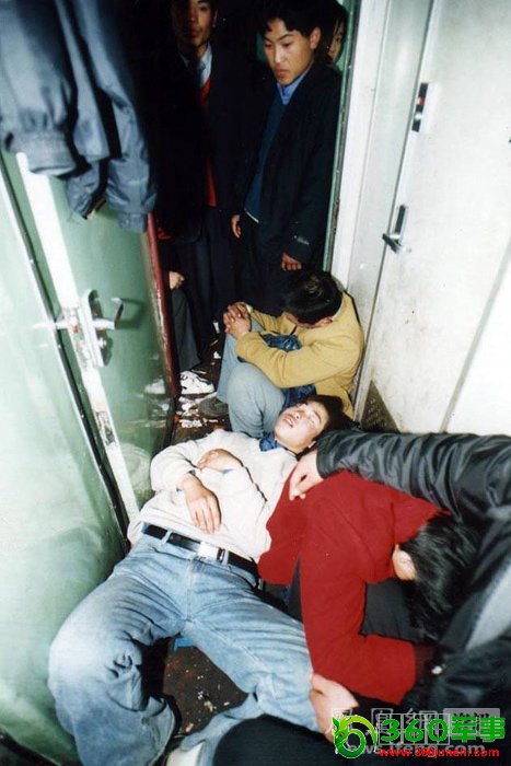 2001年2月2日,武昌开往广州的绿皮临时慢车上,车厢过道里横七竖八睡满了人。