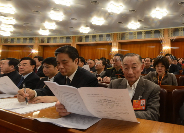 3月3日,中国人民政治协商会议第十二届全国委员会第一次会议在北京人民大会堂开幕。这是梅葆玖委员(前右)在开幕会上。