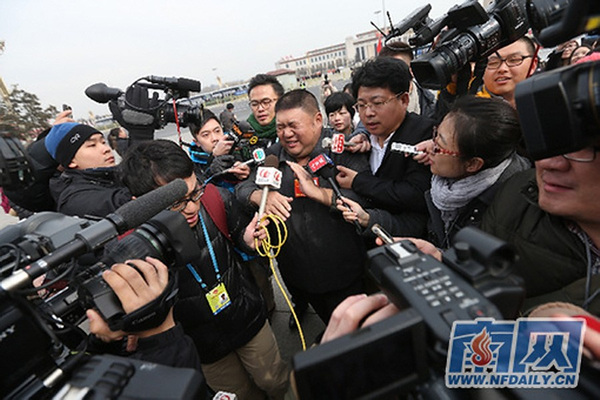 3月2日,北京,毛新宇被记者们堵住。