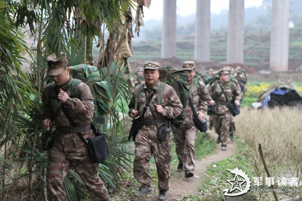 有着22年军龄的二级军士长王肃满(左二),拉练激情不减往年。