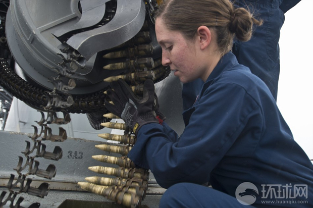 美国海军士兵给同属于艾森豪威尔号航母编队的USS Hue City号巡洋舰上的近防武器填装弹药。