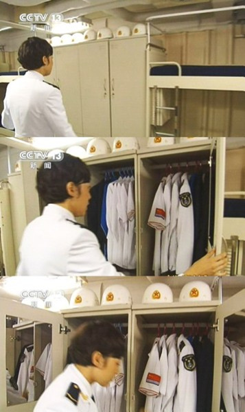 上图为女舰员生活区,据了解,航母全舰的生活条件类似,符合中国海军官兵生活条件的有关规定,请注意女舰员衣柜的顶部摆放有安全头盔,按照规定,海军官兵的衣物按照从浅色到深色排列摆放。