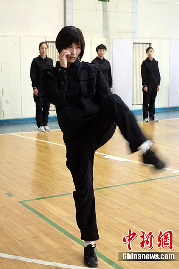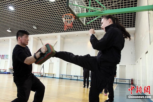 5月22日下午,在南方航空公司吉林分公司训练基地,9名女性航空安全员正在进行特训。据悉,这是东北地区首批女性航空安全员,她们在经过训练后,将于2012年6月正式登机执行任务。图为擒拿训练。