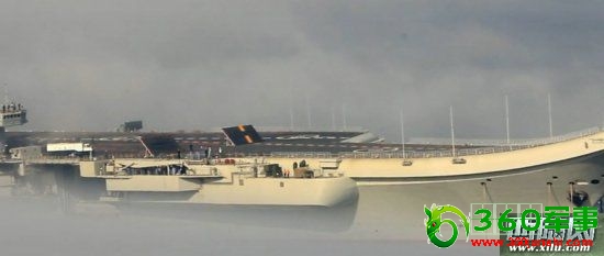 正在缓缓入港的瓦良格航母,其甲板上的两块供舰载机起降使用的挡焰板竖起